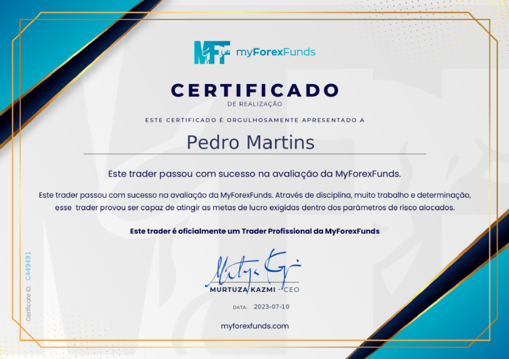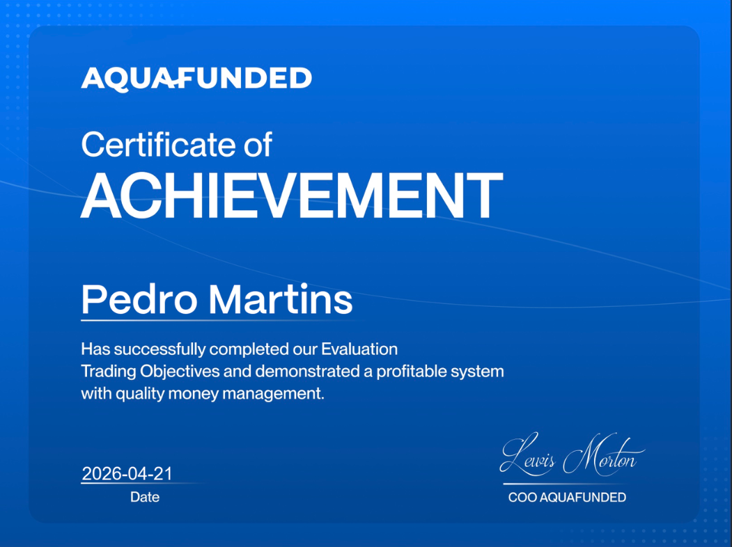 Pedro has been funded across multiple prop firms since 2023 – starting with My Forex Funds, then transitioning to Alpha Capital and AquaFunded after MFF shut down. Below are his official Certificates of Achievement from each.